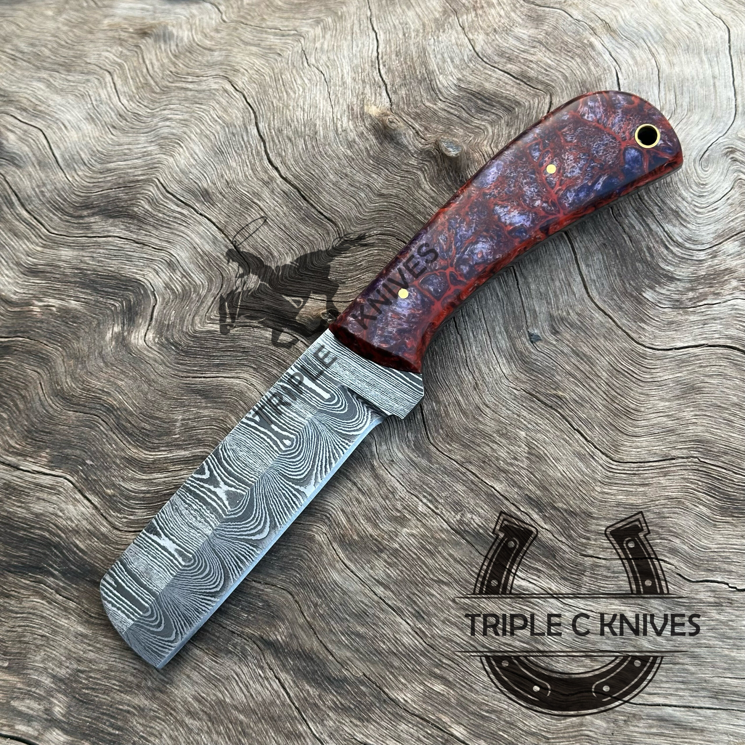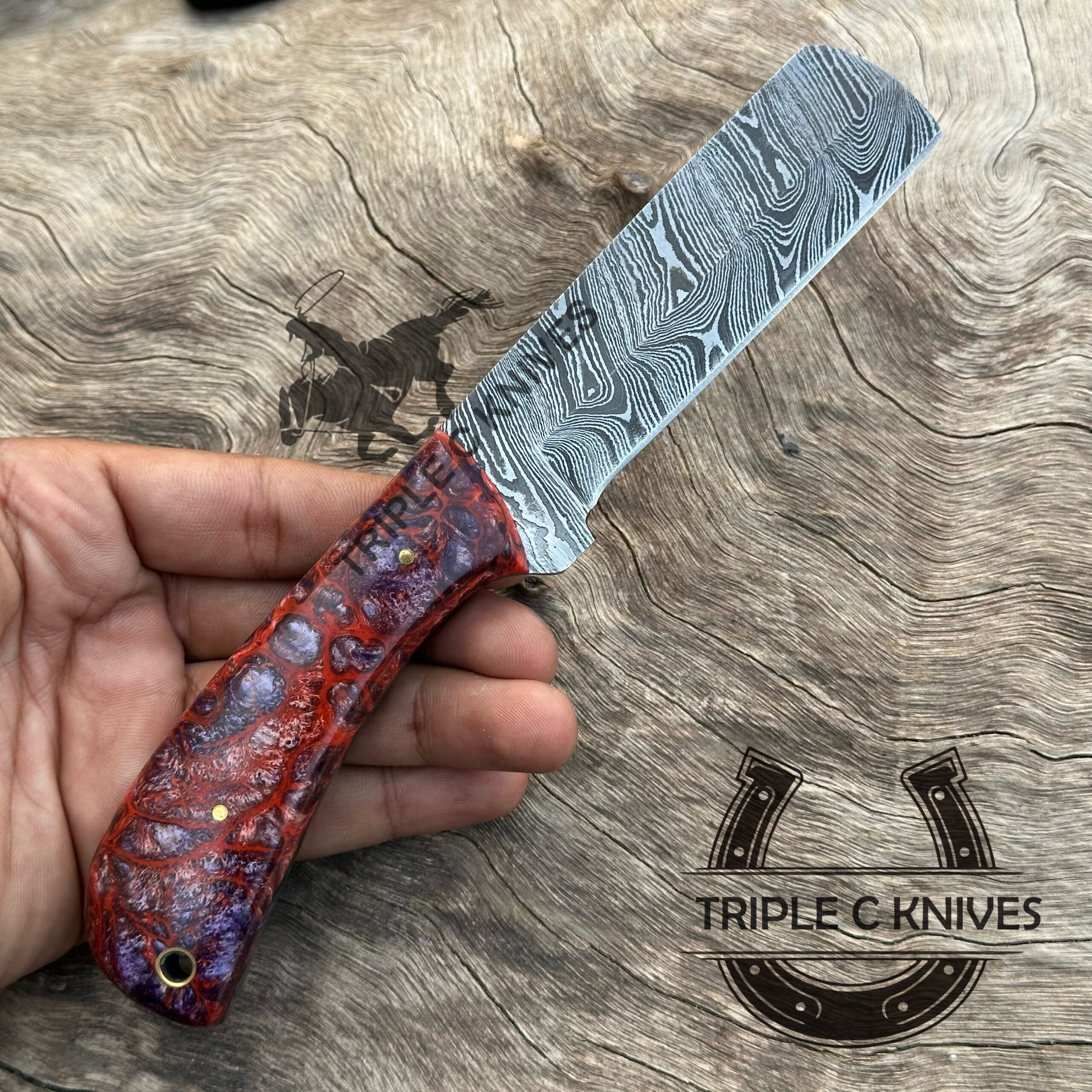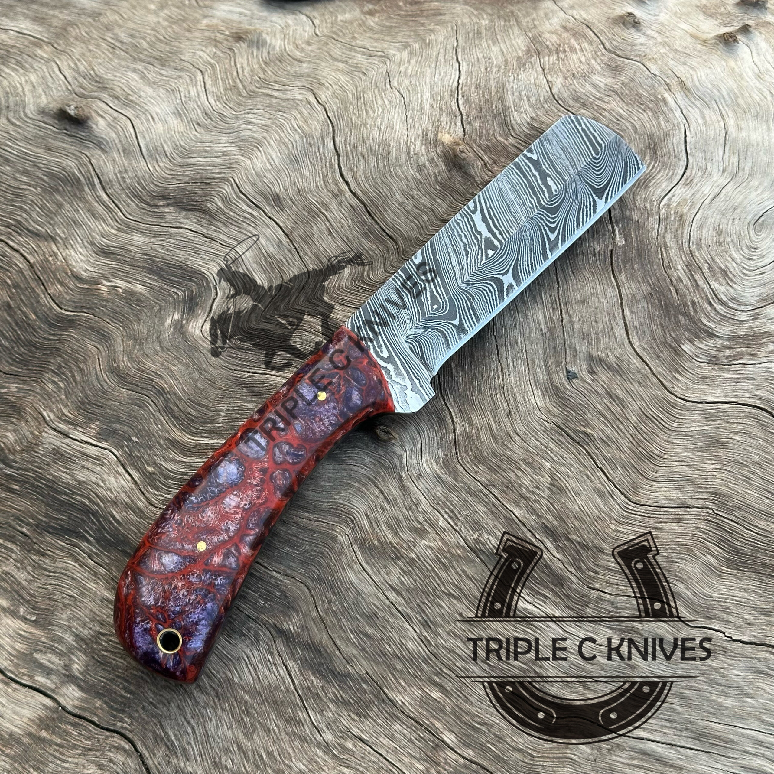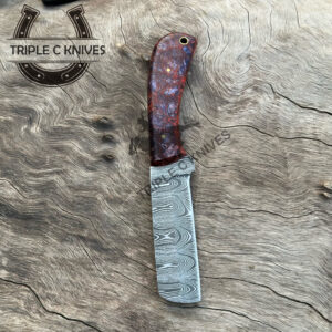 Our Damascus blades are made from high quality non-stainless steels which rival or exceed any Damascus blade made from the 10 series with 15N20. Our Damascus combination has taken years to perfect and has been tested under a variety of application which will offer professional performance in categories of toughness, strength (lateral stress) and edge honing and holding ability. In a 5 spot Rockwell test our blades will average near or close to 58 which offers a perfect balances between its toughness and strength.Our blades due to carbon content need to be regularly treated with wax and/or 3 in 1 oil to maintain its superior quality.
