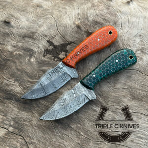Our Damascus blades are made from high quality non-stainless steels which rival or exceed any Damascus blade made from the 10 series with 15N20. Our Damascus combination has taken years to perfect and has been tested under a variety of application which will offer professional performance in categories of toughness, strength (lateral stress) and edge honing and holding ability. In a 5 spot Rockwell test our blades will average near or close to 58 which offers a perfect balances between its toughness and strength.Our blades due to carbon content need to be regularly treated with wax and/or 3 in 1 oil to maintain its superior quality.