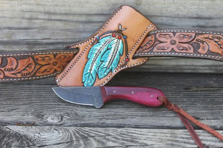 Custom Made handmade Damascus steel Fixed Blade cowboy knife & leather belt